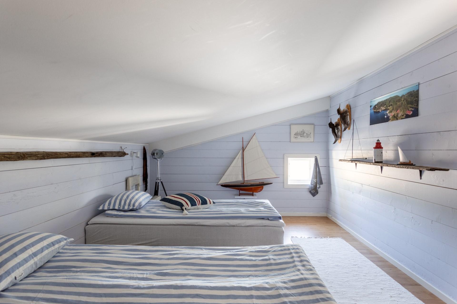 På det övre planet finns tre sovrum, två duschrum varav ett med badkar, ett allrum/kontor, tre stora garderober, en walk-in-closet samt en balkong med utsikt över gården.