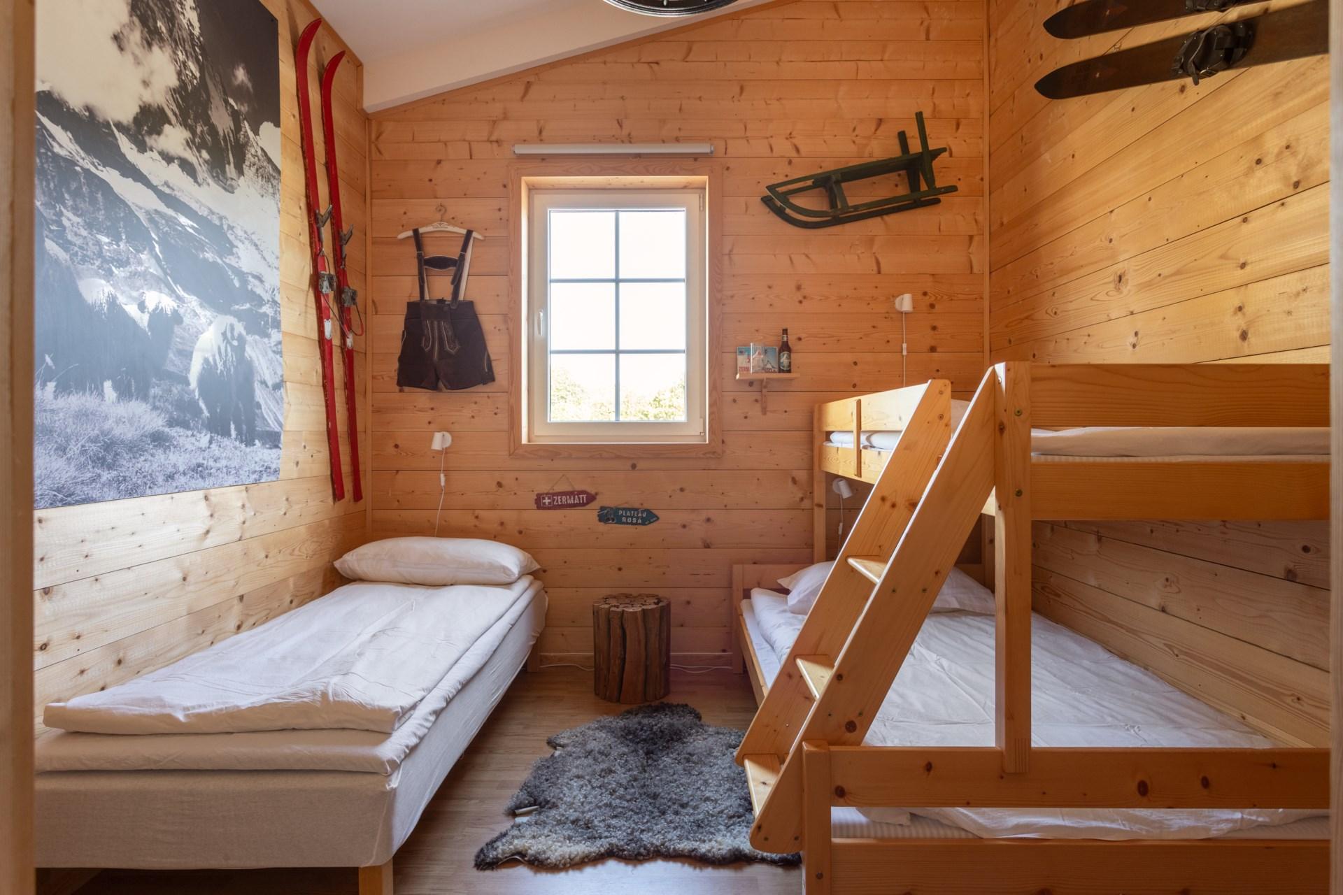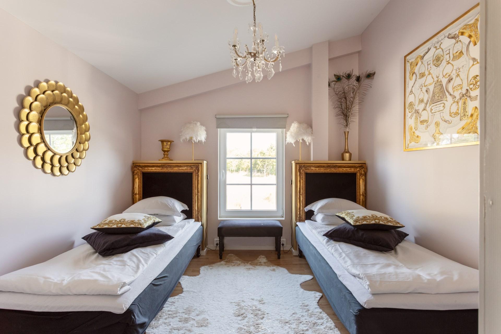 På andra våningen finns en ljus och luftig lägenhet om ca 120 kvm med fem sovrum, dusch, toalett samt ett stort vardagsrum och kök med panoramafönster som vetter mot ridhuset , hagar och utebana . Alla rum har golvvärme, och kök och vardagsrum har en imponerande takhöjd på ca 5 meter. Sovrummen är unikt inredda med teman: Skärgårds-, Guld-, Alp-, Vilda- och Hundrummet.