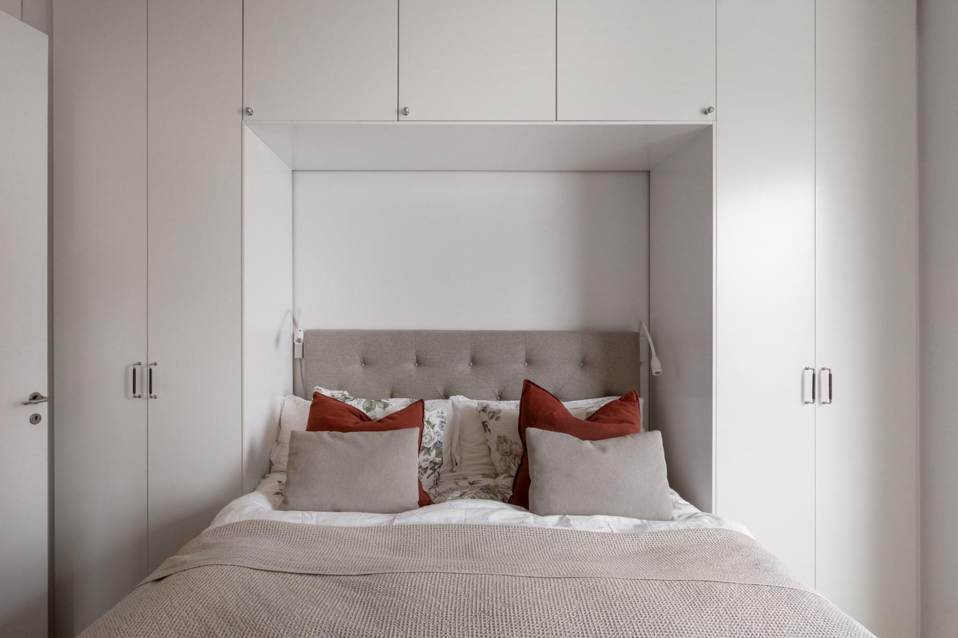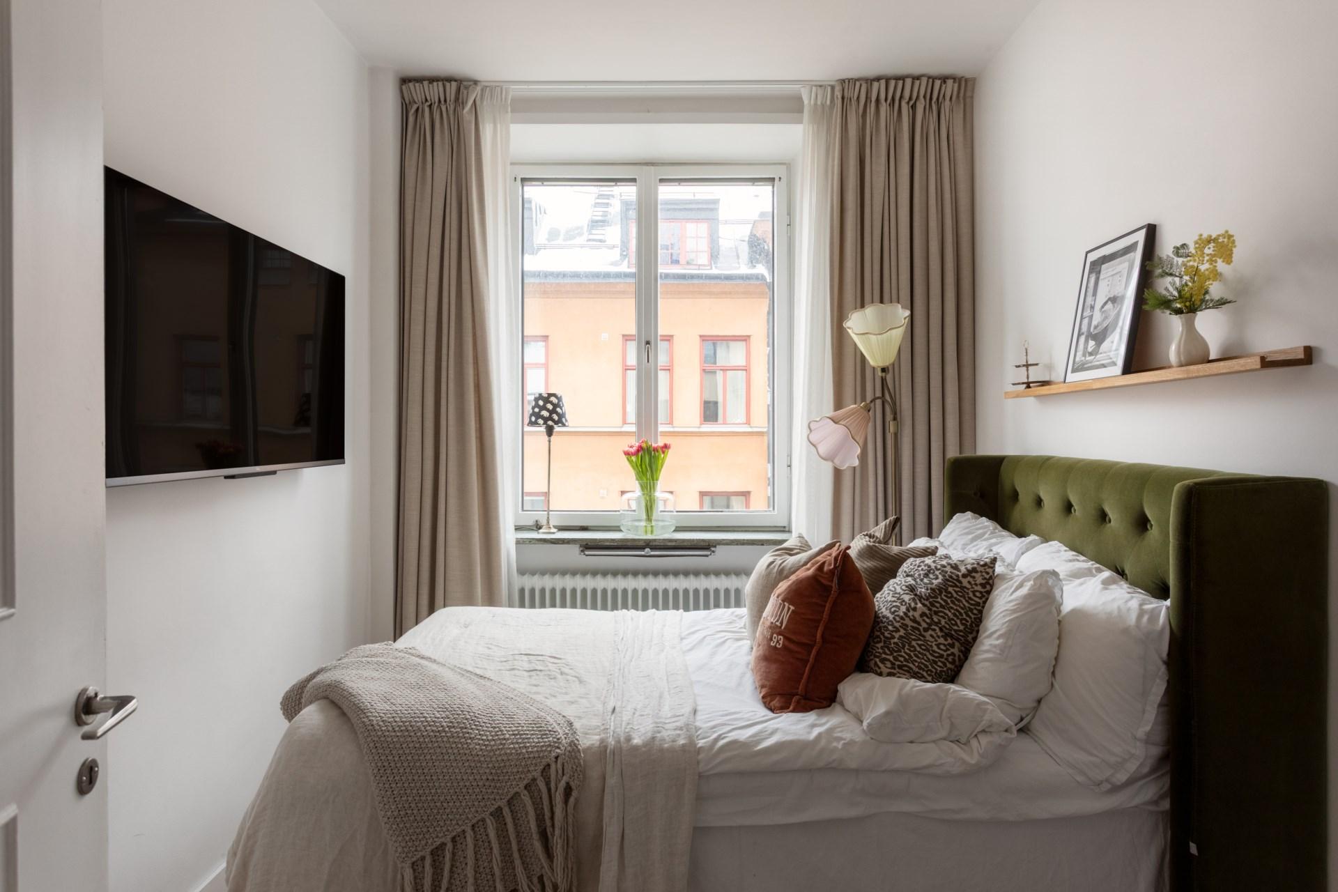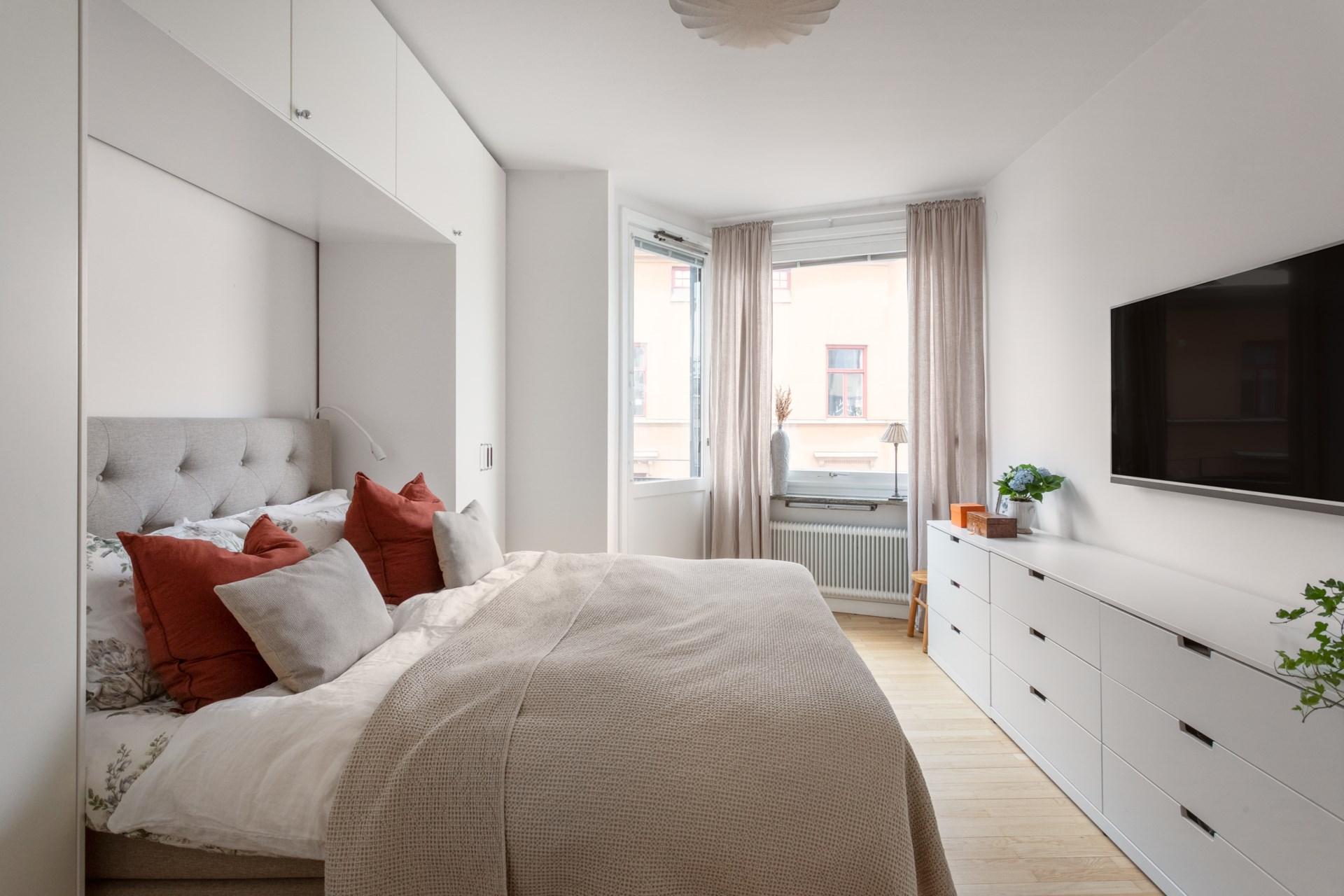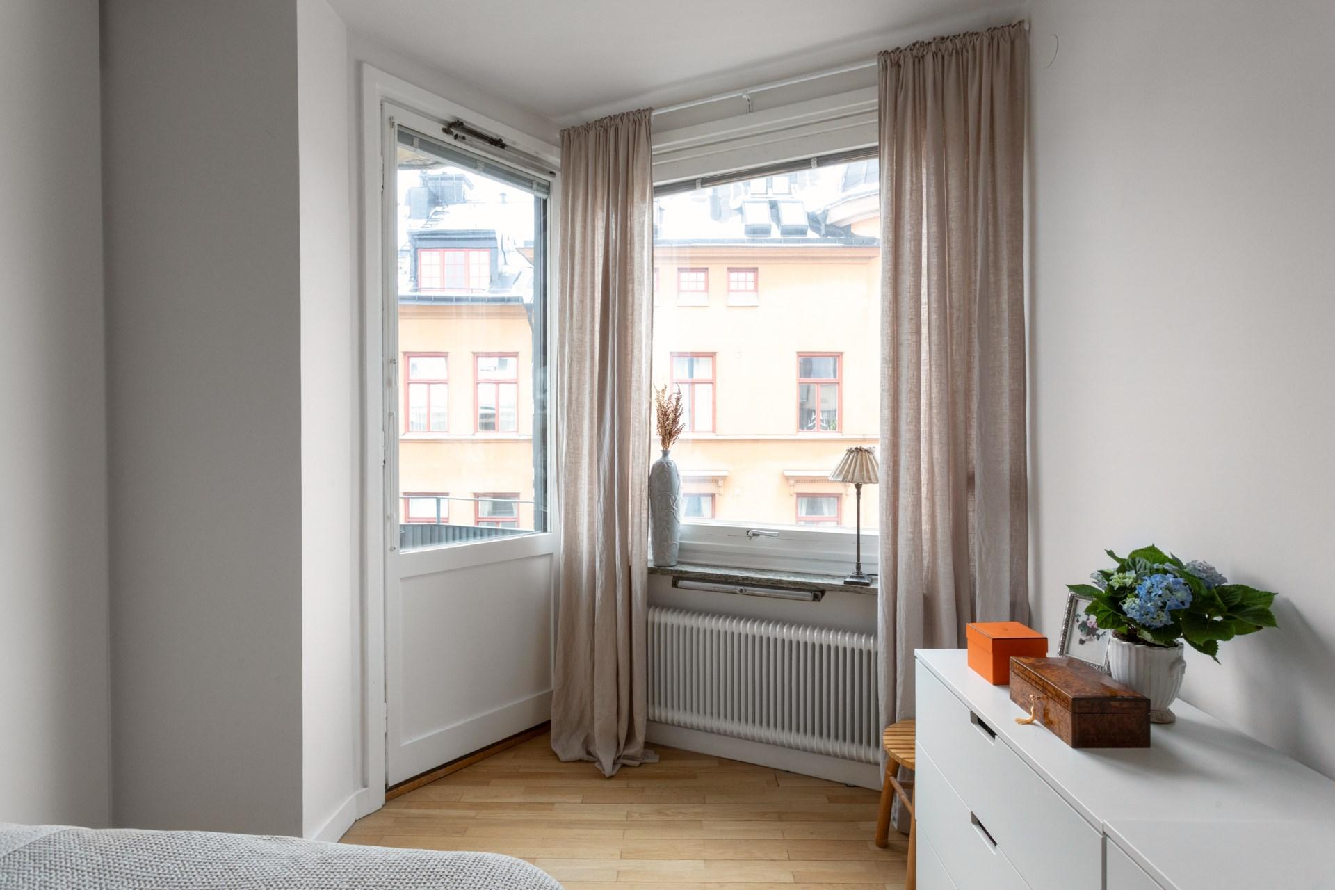 Master bedroom erbjuder ett rofyllt utrymme med både plats för dubbelsäng och förvaring i platsbyggda garderober. Genom pardörrar nås den mysiga hallen med den öppna spisen – en plats för avkoppling eller för att skapa en lugn atmosfär innan natten. En egen balkong mot Vegagatan bjuder på utsikt över vackra fasader och den pampiga kyrkan.