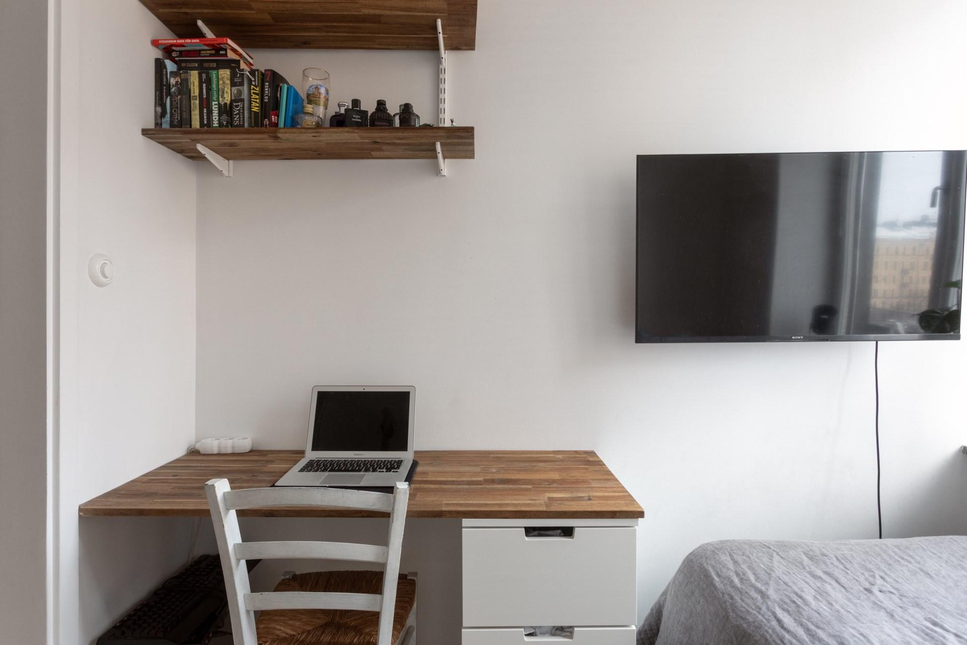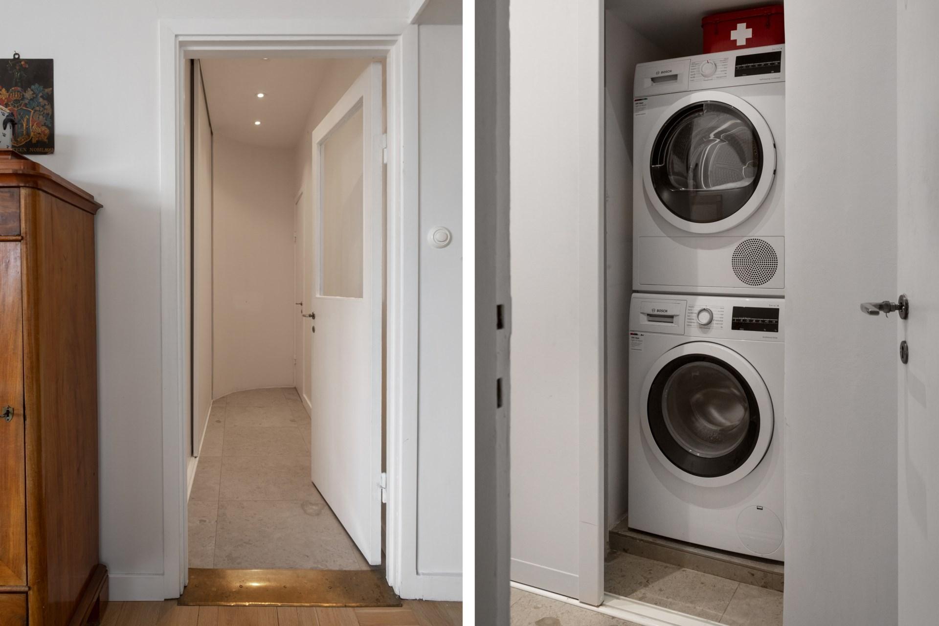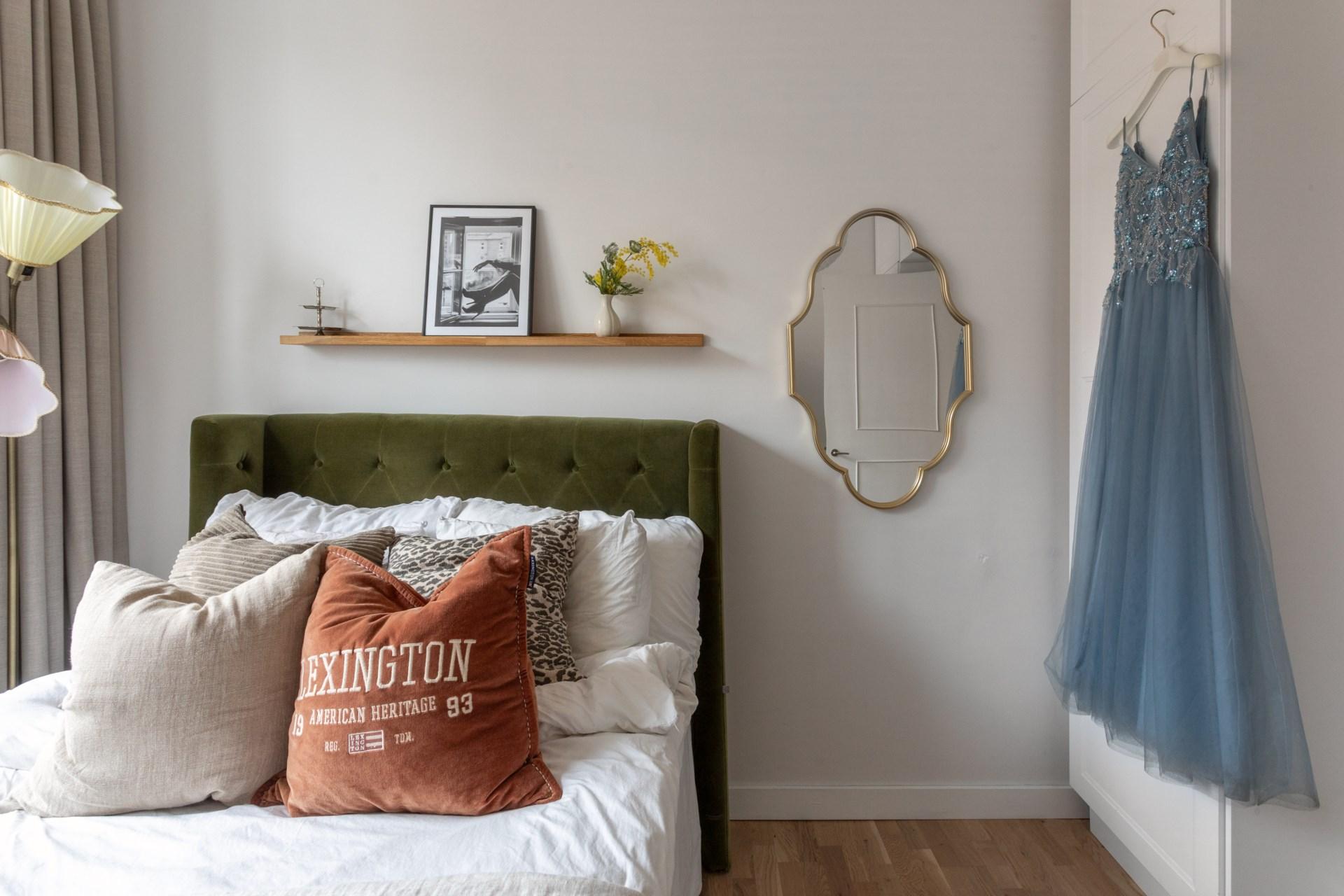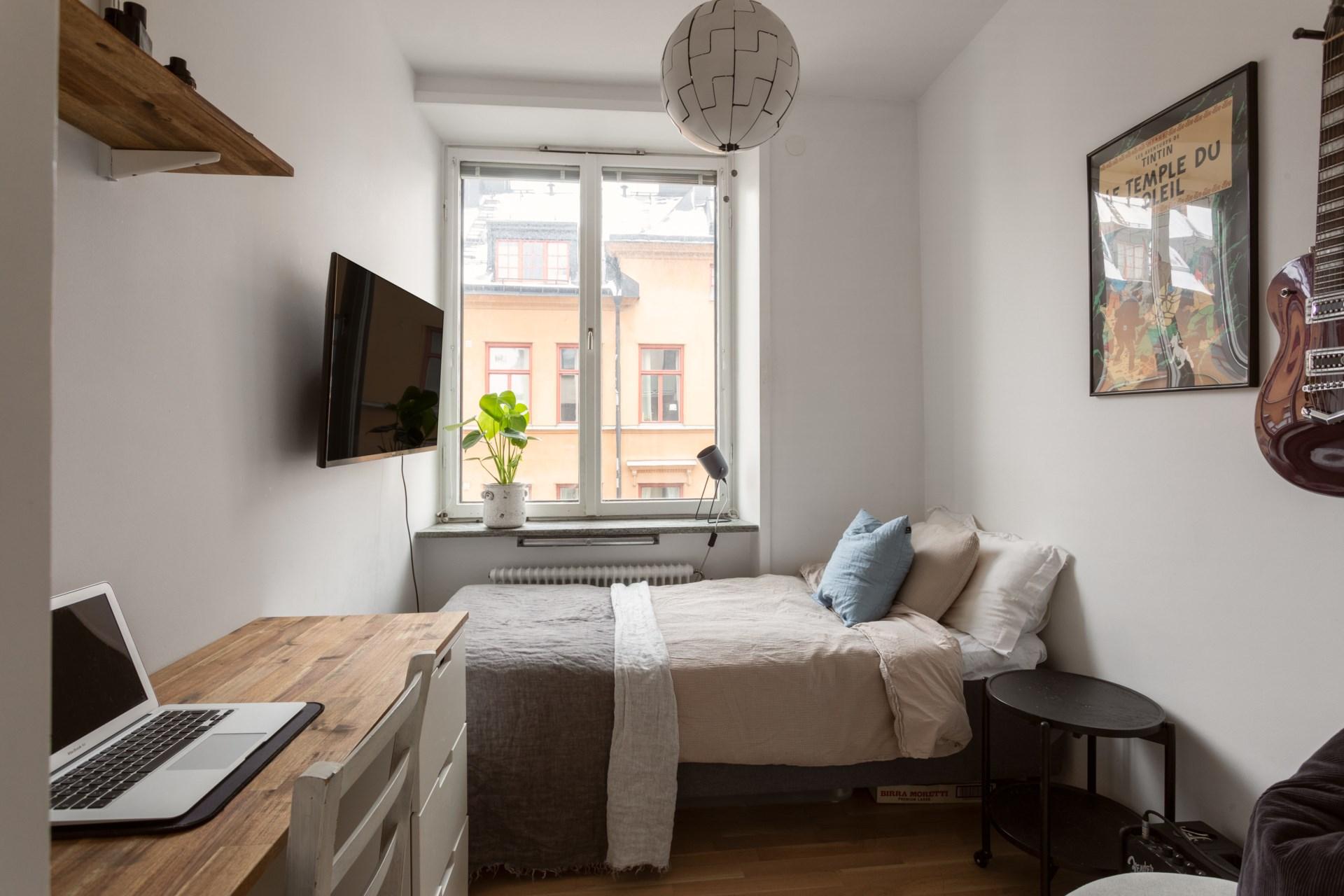 Master bedroom erbjuder ett rofyllt utrymme med både plats för dubbelsäng och förvaring i platsbyggda garderober. Genom pardörrar nås den mysiga hallen med den öppna spisen – en plats för avkoppling eller för att skapa en lugn atmosfär innan natten. En egen balkong mot Vegagatan bjuder på utsikt över vackra fasader och den pampiga kyrkan.