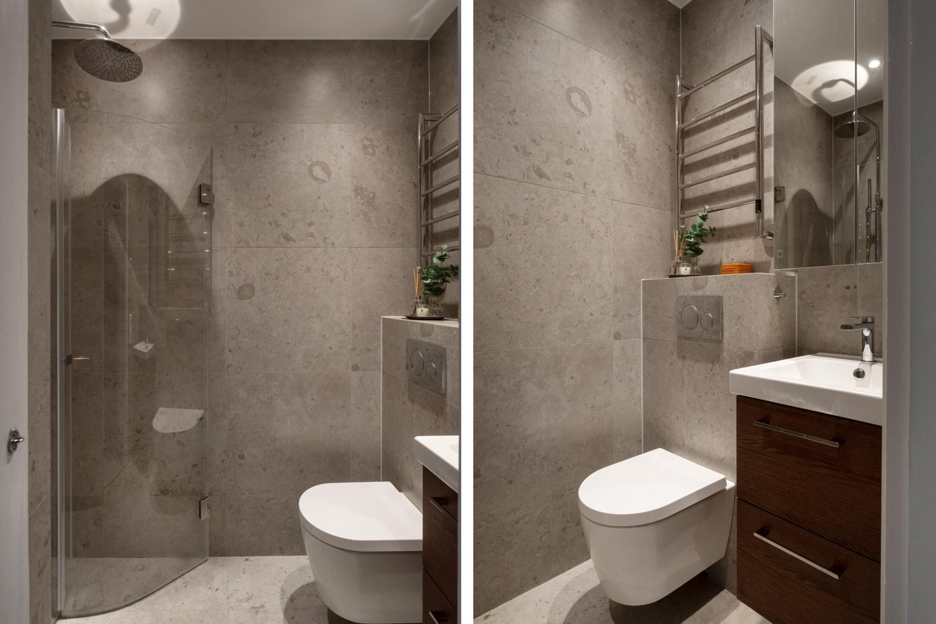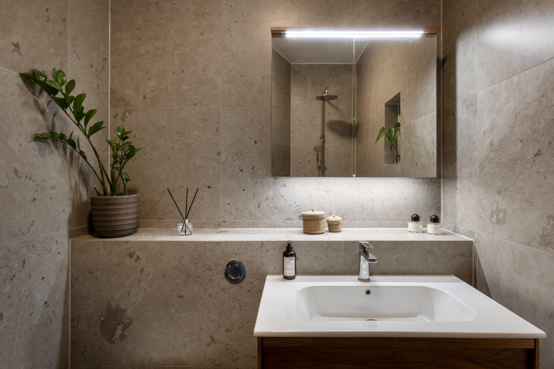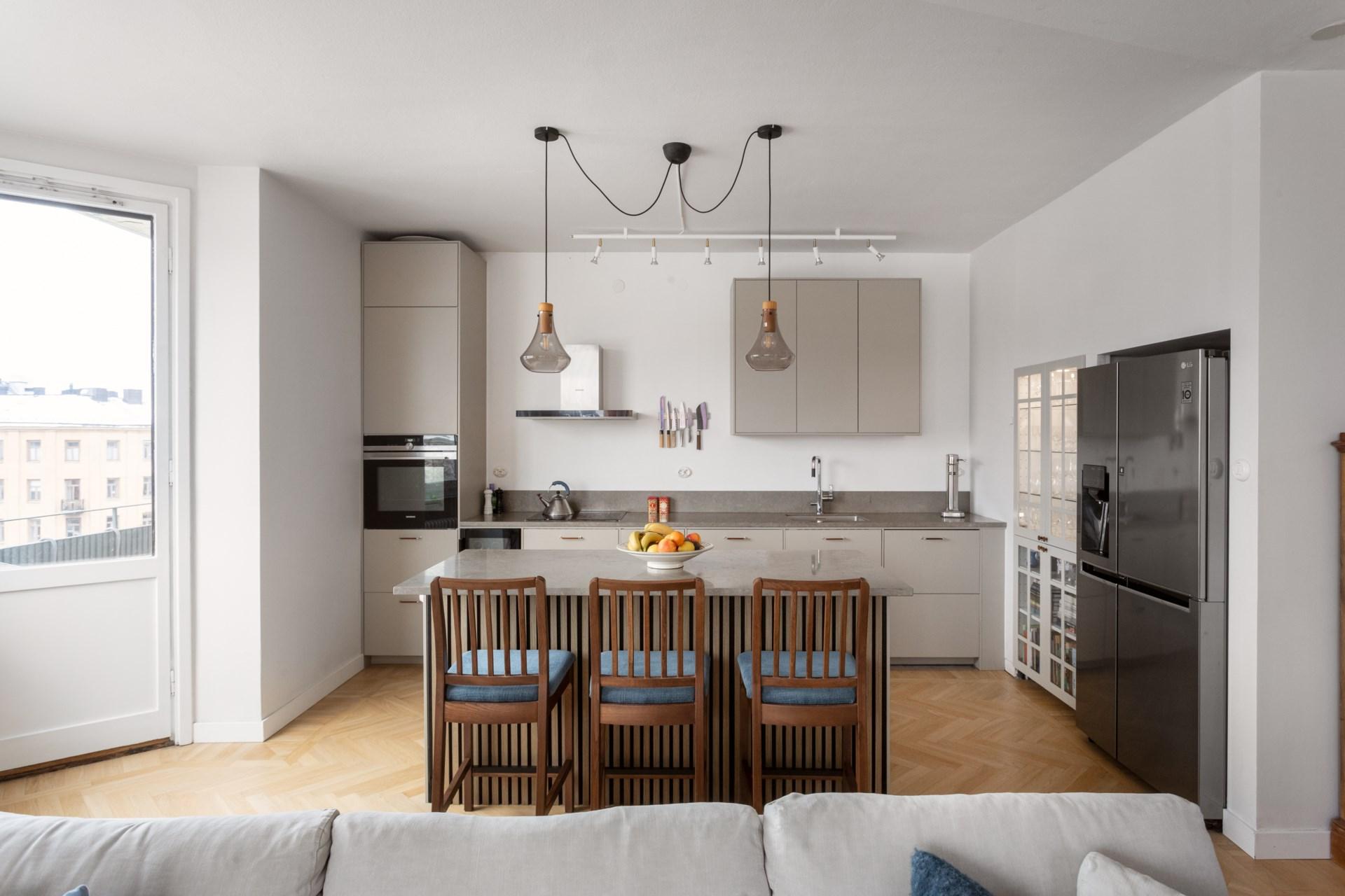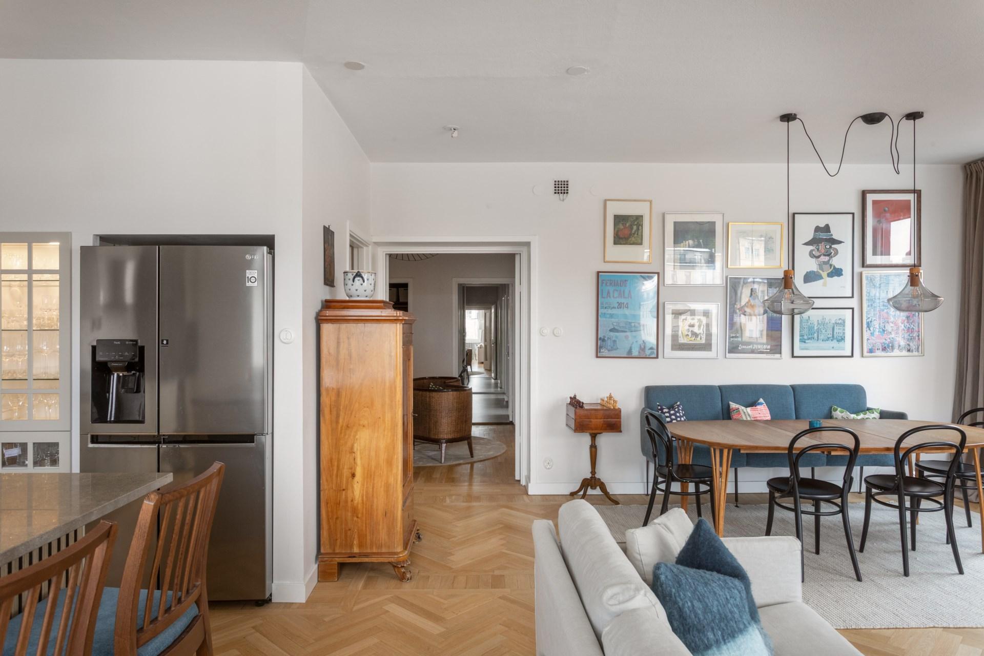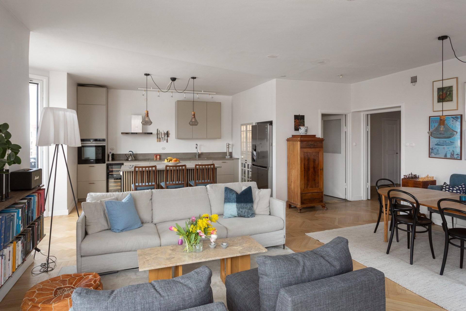 Bostaden om 117 kvm renoverades omsorgsfullt i samband med stambytet 2021. Genomgående exklusiva materialval, fiskbensmönstrad ekparkett och två påkostade badrum klädda i vacker kalksten.