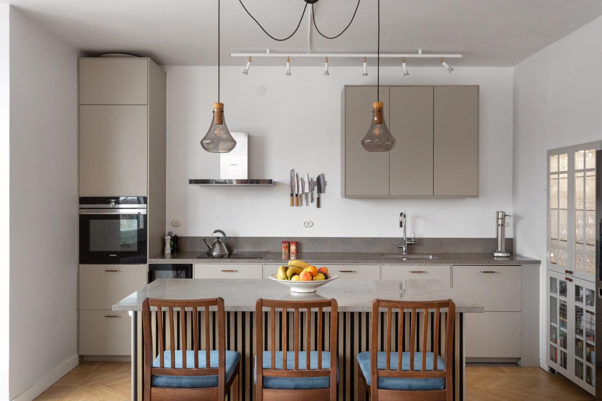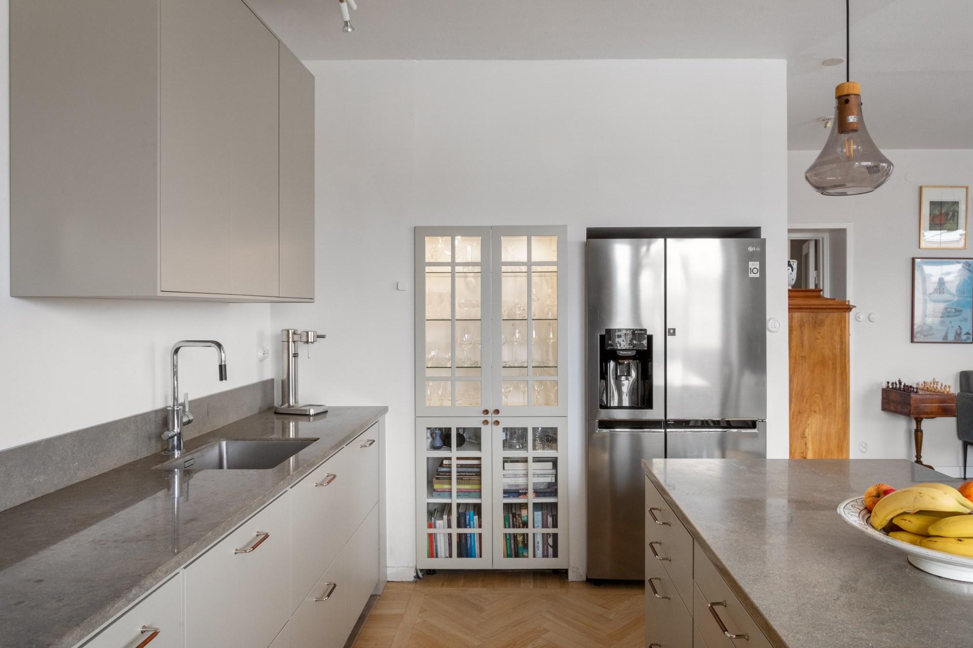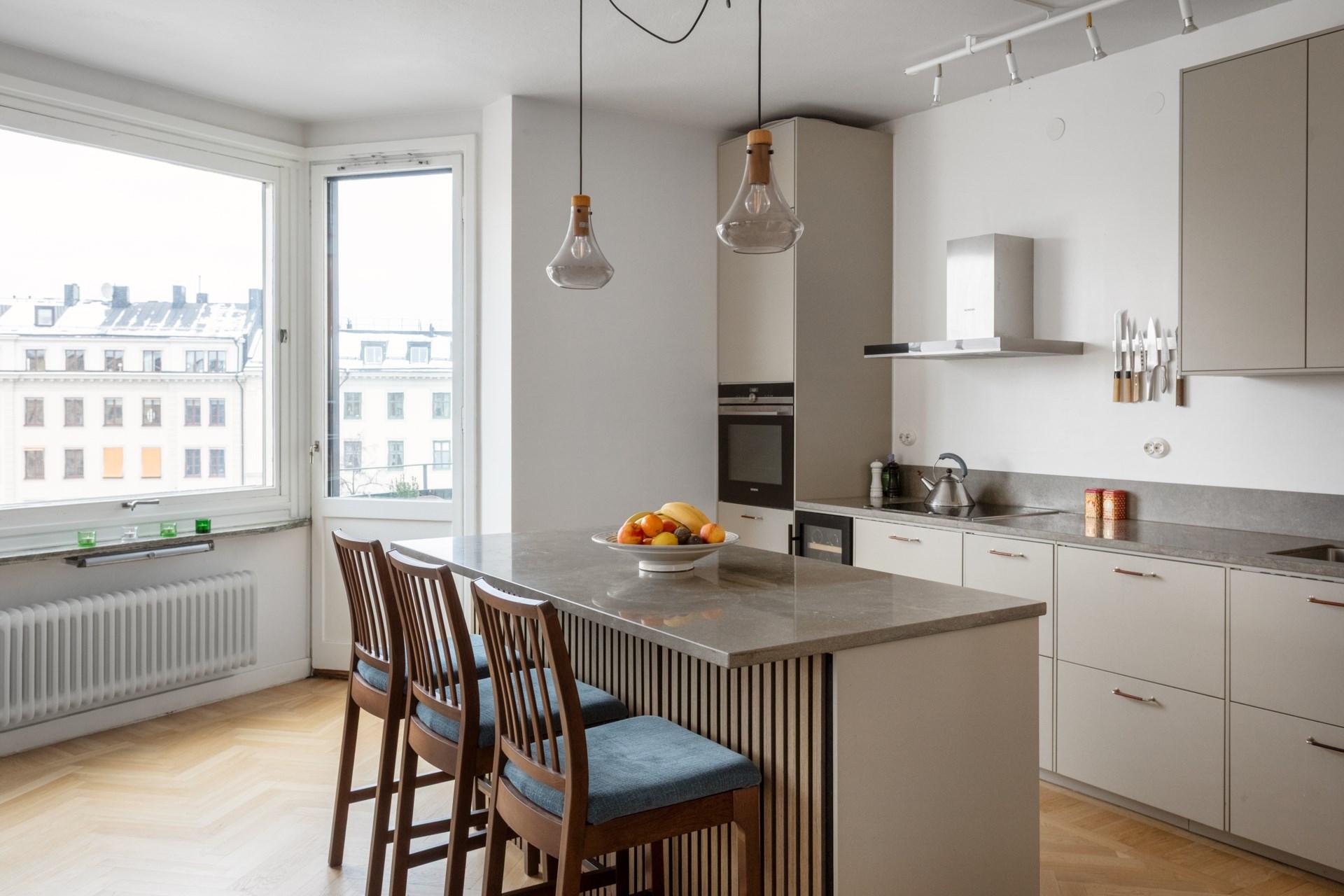 Det moderna köket erbjuder utsökta ytskikt med släta ytor, stilrena vitvaror och generösa arbetsytor – perfekt för både matlagning och socialt umgänge. Den öppna planlösningen mellan kök och vardagsrum skapar en luftig känsla, medan de stora fönsterpartierna ger ett rikligt ljusflöde och en härlig utsikt. Här finns även en köksö, som ger både extra förvaring och en central plats i rummet.