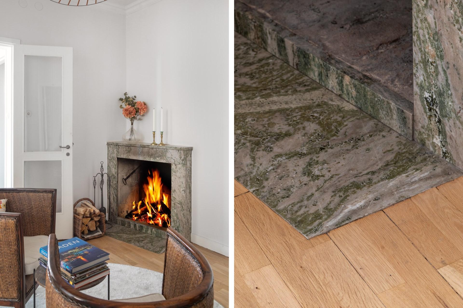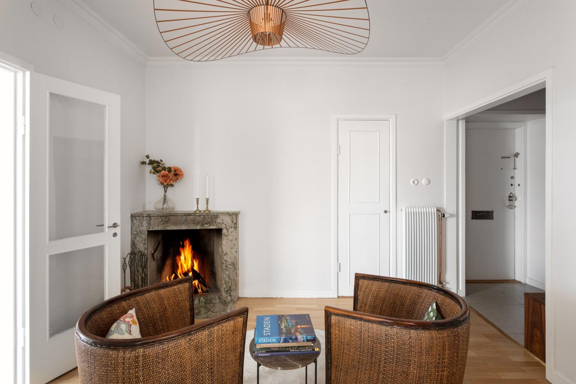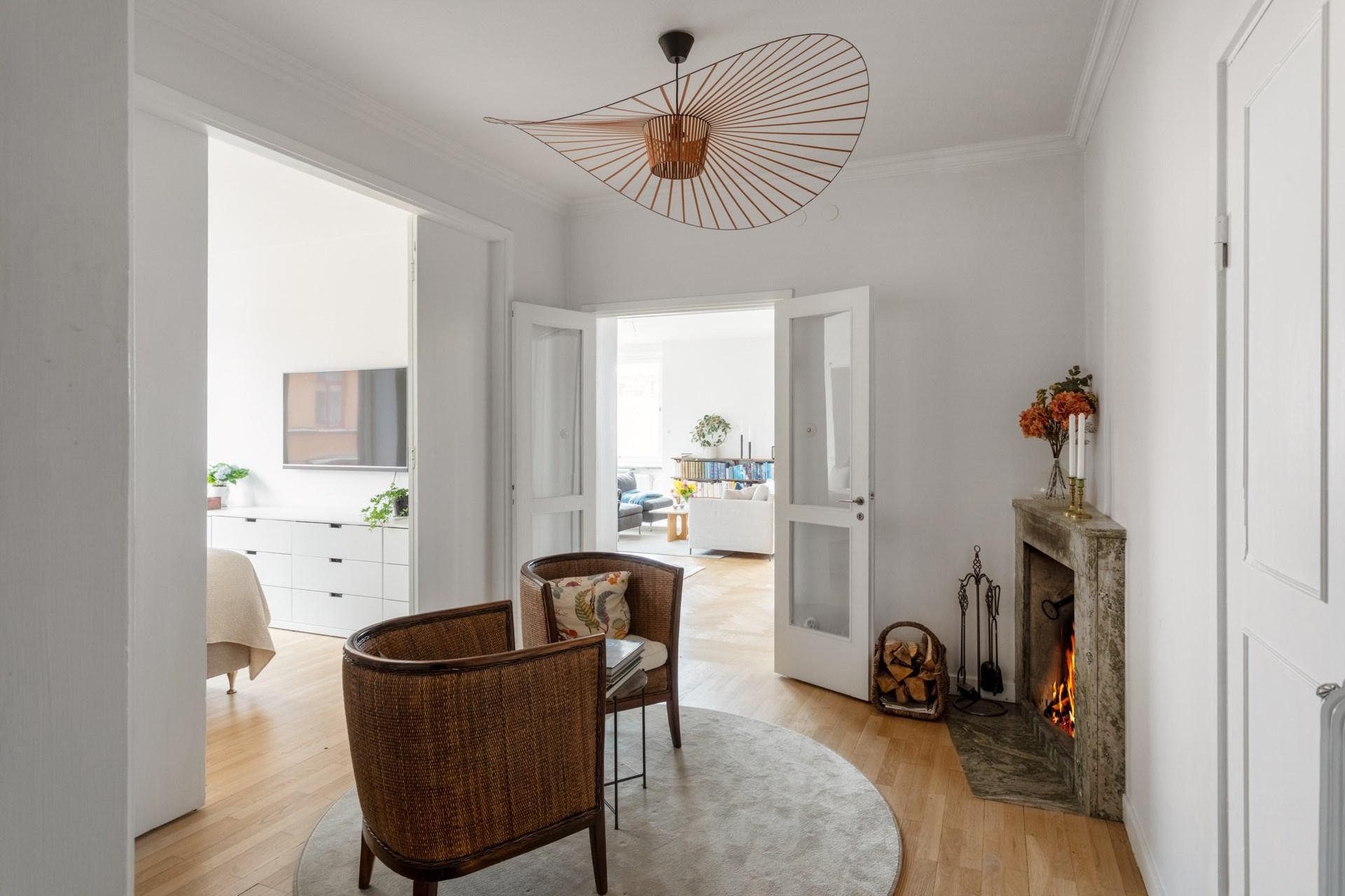 Den möblerbara hallen ger en förstklassig känsla med sin öppna spis och den eleganta spiselkransen i Kolmårdsmarmor. Härifrån nås både vardagsrum och sovrumsdel, vilket skapar en naturlig uppdelning mellan de sociala ytorna och de privata rummen.