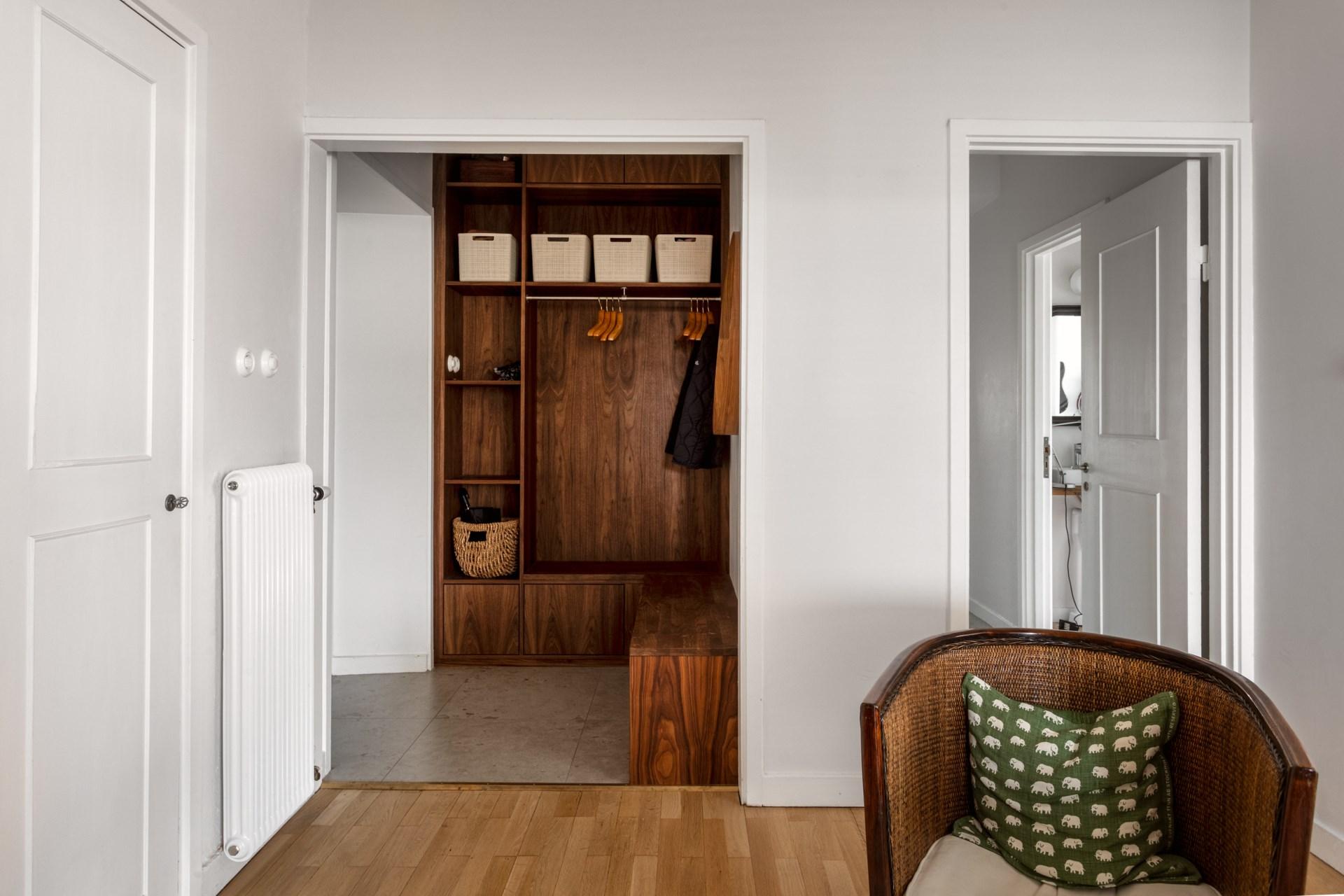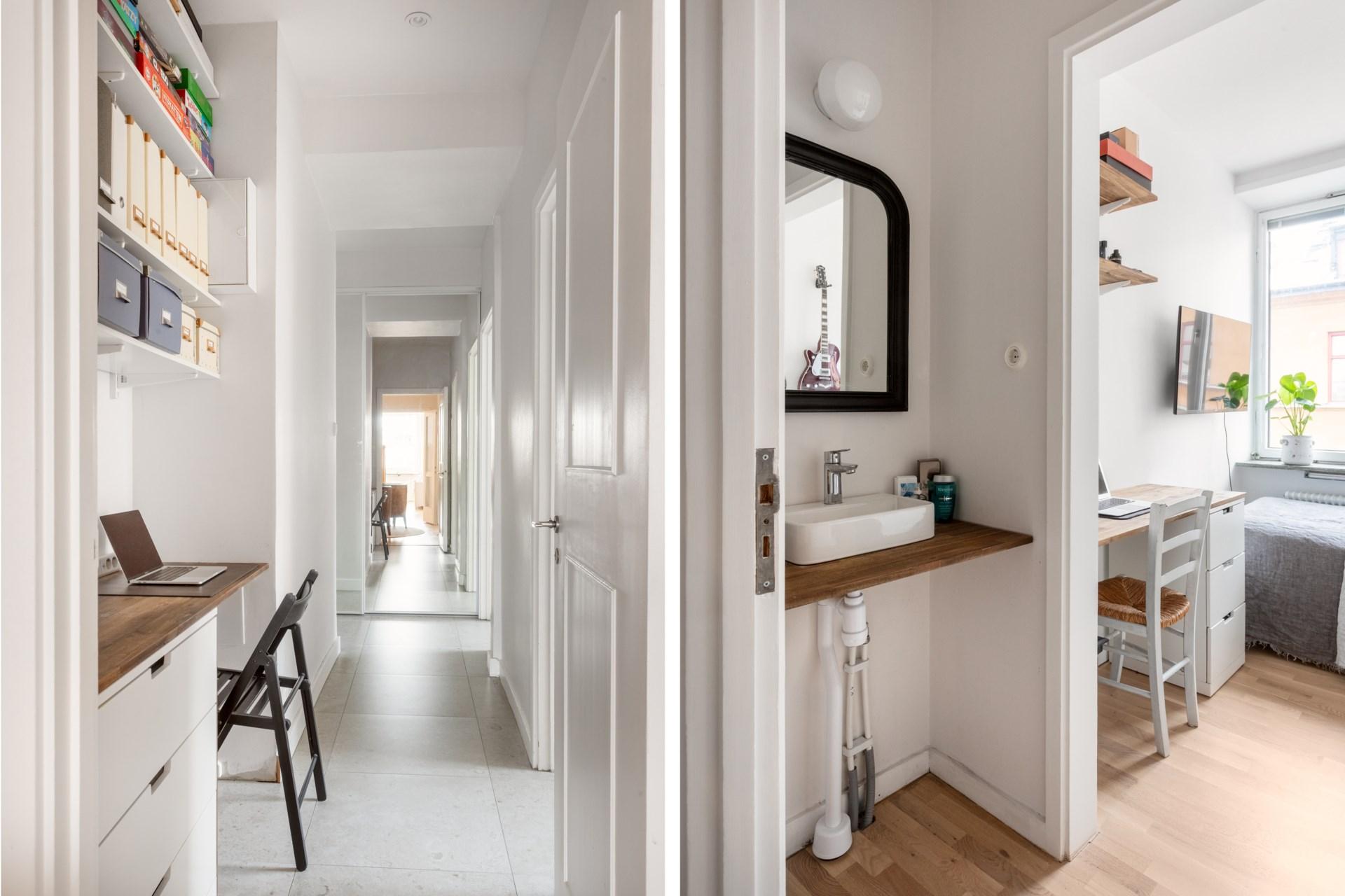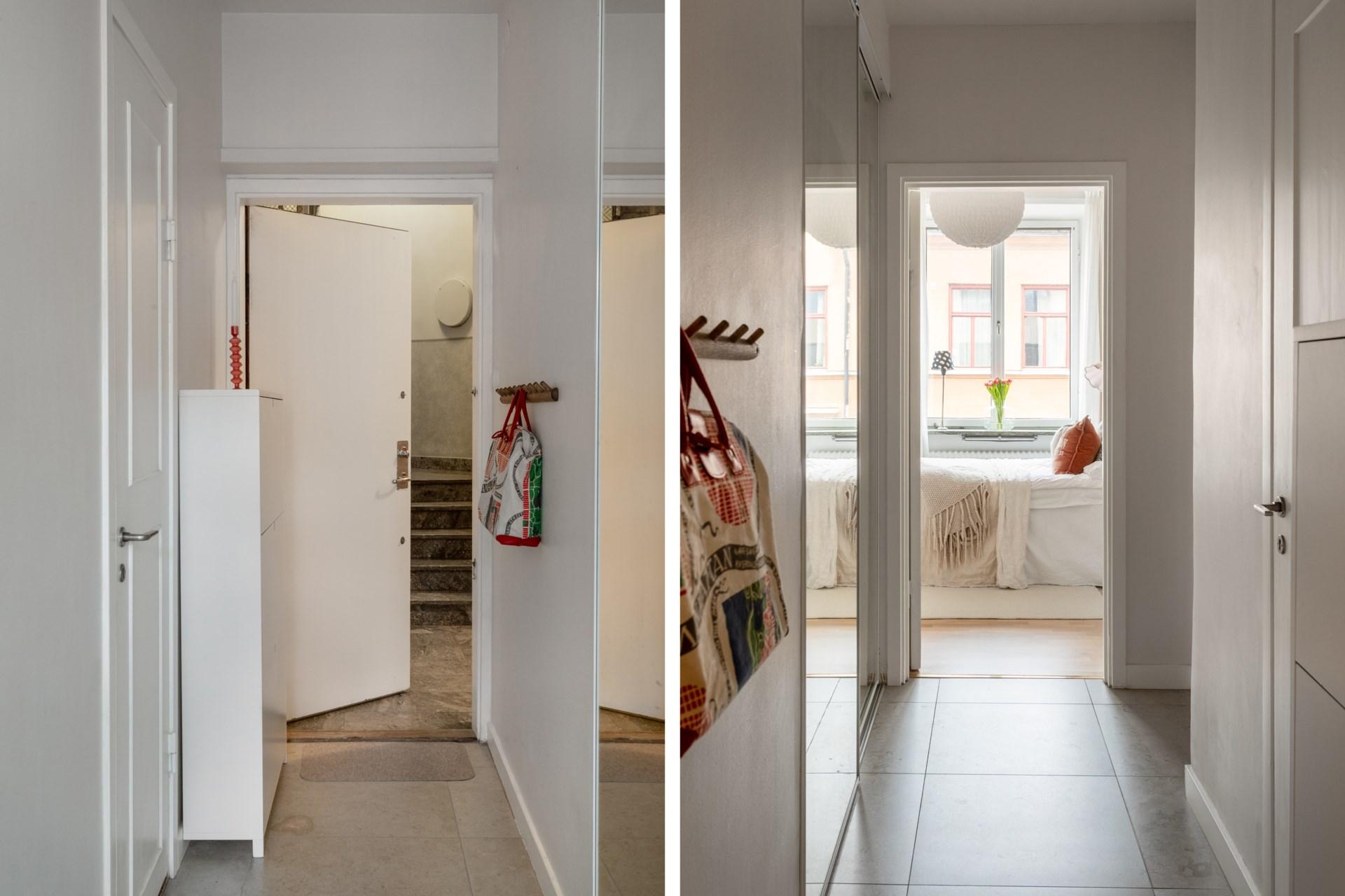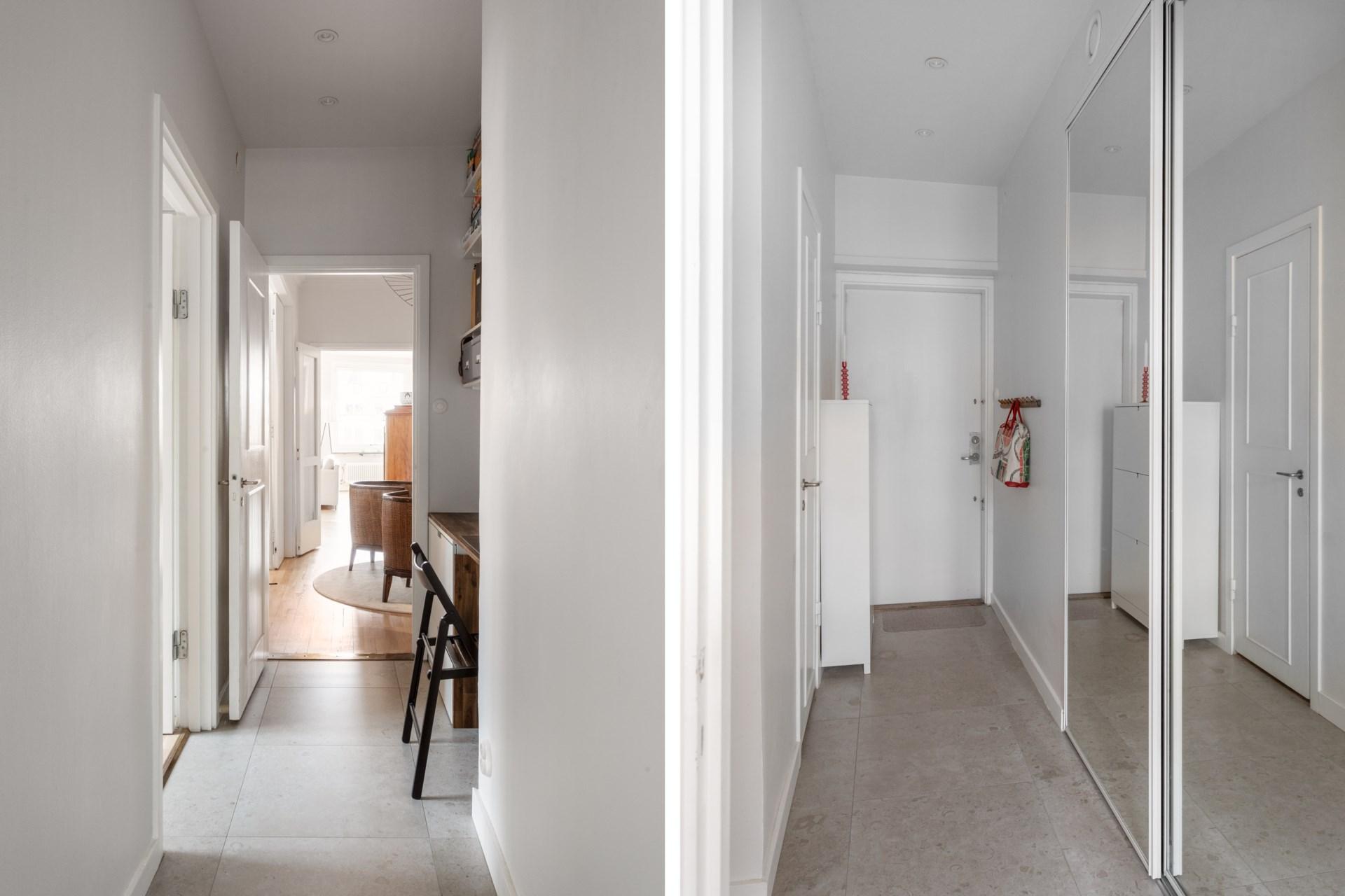Den möblerbara hallen ger en förstklassig känsla med sin öppna spis och den eleganta spiselkransen i Kolmårdsmarmor. Härifrån nås både vardagsrum och sovrumsdel, vilket skapar en naturlig uppdelning mellan de sociala ytorna och de privata rummen.