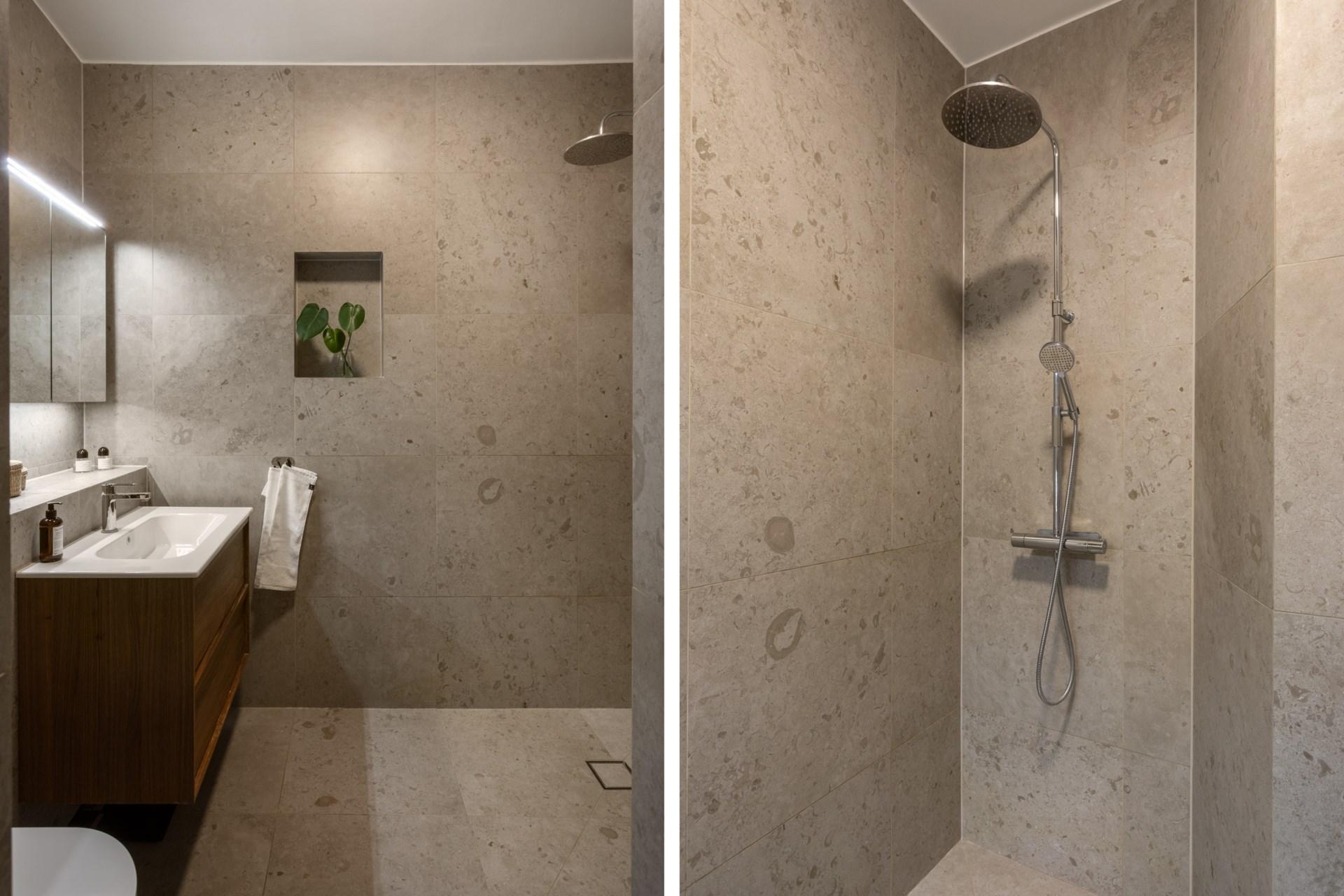 De två andra sovrummen erbjuder också god plats för både dubbelsäng och möblemang. Här finns möjlighet att skapa ett hemmakontor eller gästrum. De två påkostade badrummen är stilrent inredda med exklusiva material som kalksten och har generösa duschutrymmen. Det större badrummet erbjuder dessutom en tvättpelare med tvättmaskin och torktumlare.